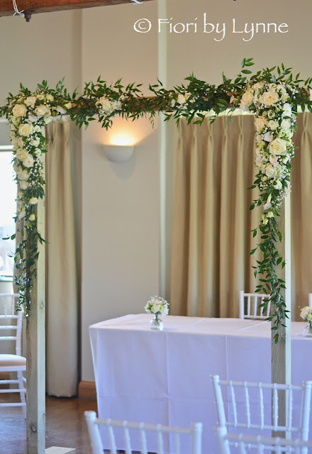Classic wooden arch decorated for Sarah and James' wedding ceremony in whites, greens and fresh mint using roses, lisianthus, calla lilies and gypsophila. After the ceremony it was moved back a couple of feet behind the top table . So if you are wondering if the arch design is moveable the answer is yes - but not very far and depending on the venue